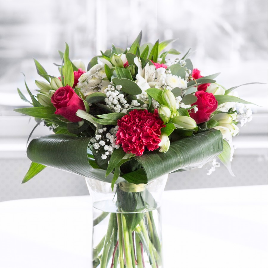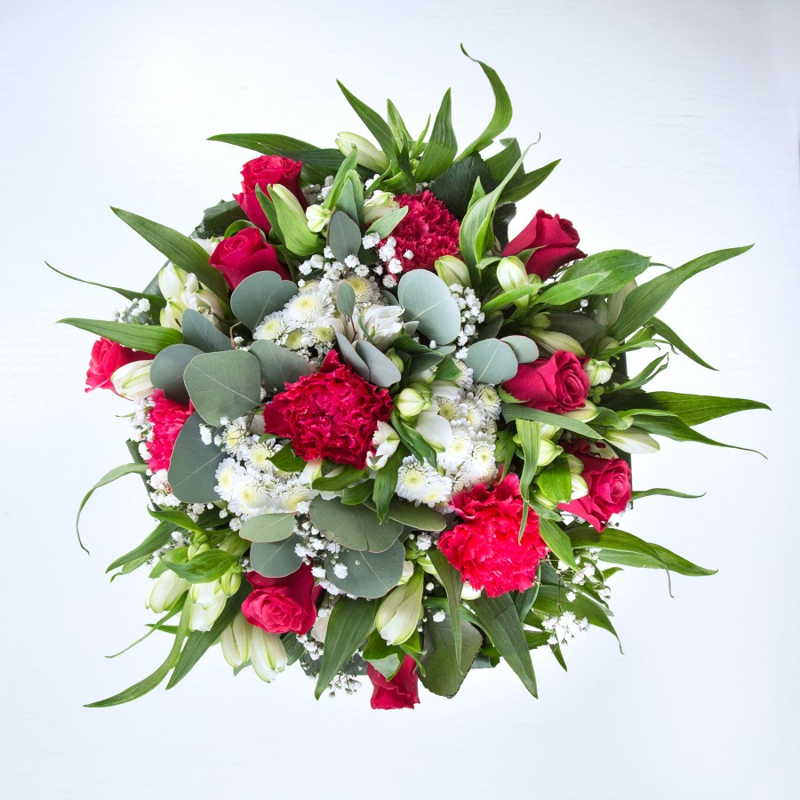 Capture hearts with our beautiful bouquet featuring rich red roses and elegant white chrysanthemums. This stunning arrangement is thoughtfully combined with soft gypsophila and vibrant carnations, all enhanced by white alstroemeria and aspidistra leaves. Each flower is hand-selected to ensure maximum freshness and longevity.